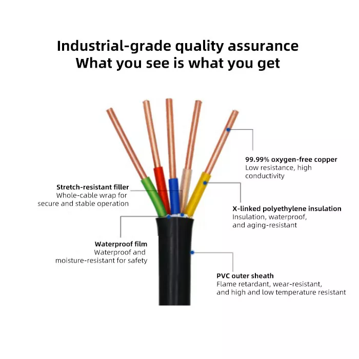 2. Stabiele werking op hoge temperatuur: XLPE-isolatie zorgt ervoor dat de vuurbestendige XLPE-geïsoleerde PVC-omhulde voedingskabel stabiel is in normale omgevingen met hoge temperaturen of in geval van overbelasting.